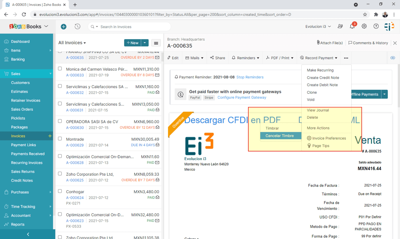 Facturación electrónica SAT y CFDI con Zoho Books y Ei3